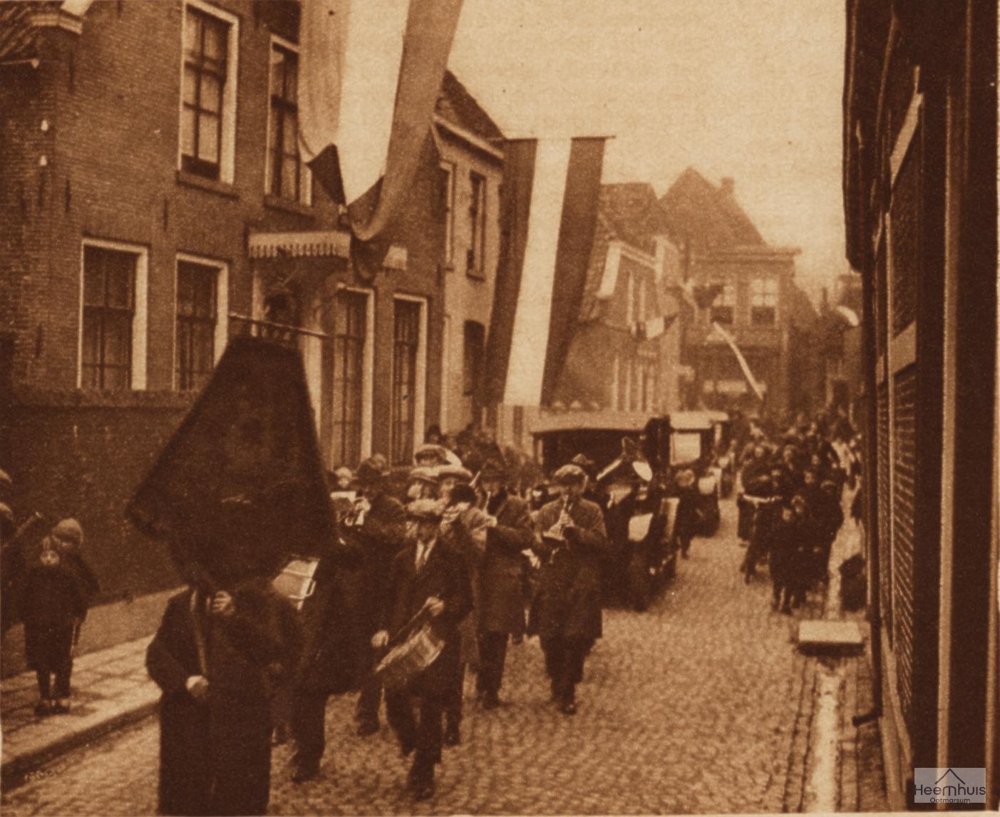 “De feestelijke ontvangst van den nieuwen Burgemeester van Ootmarsum: de stoet op weg naar het gemeentehuis voorop het muziek St. Caecilia.”