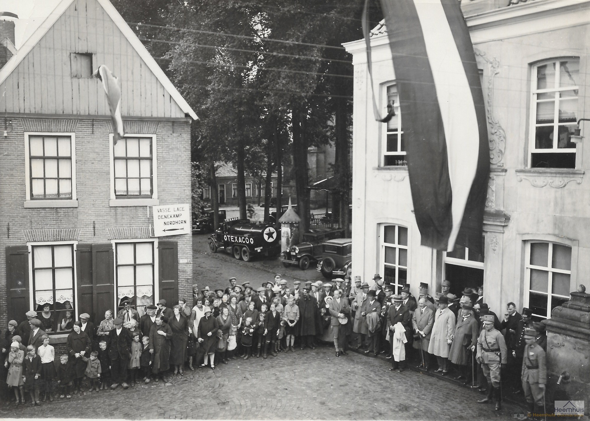 Deze foto is genomen ter gelegenheid van de B.V.L. (Bijzondere Vrijwillige Landstorm) dag op 3 september 1932. Een zware delegatie uit Den Haag werd op het stadhuis ontvangen door burgemeester jhr. Egon von Bönninghausen (1899-1943) ("NSB politicus"). Tegenwoordig waren o.a. Mr. Dr. L.N. Deckers, minister van Defensie, Mr. A.E. Baron van Voorst tot Voorst, L.F. Duymaer van Twist, overste Ingen Schoute, overste Meinster, res. kapitein Boulogne, de burgemeesters van Haaksbergen, Hengelo, Denekamp, Almelo, Borne etc., de heer G.H.P. Bloemen (1884-1971), lid van Ged. Staten. Na het opstellen van het defilé vertrok het gezelschap naar hotel De la Poste voor een gezamenlijke lunch.